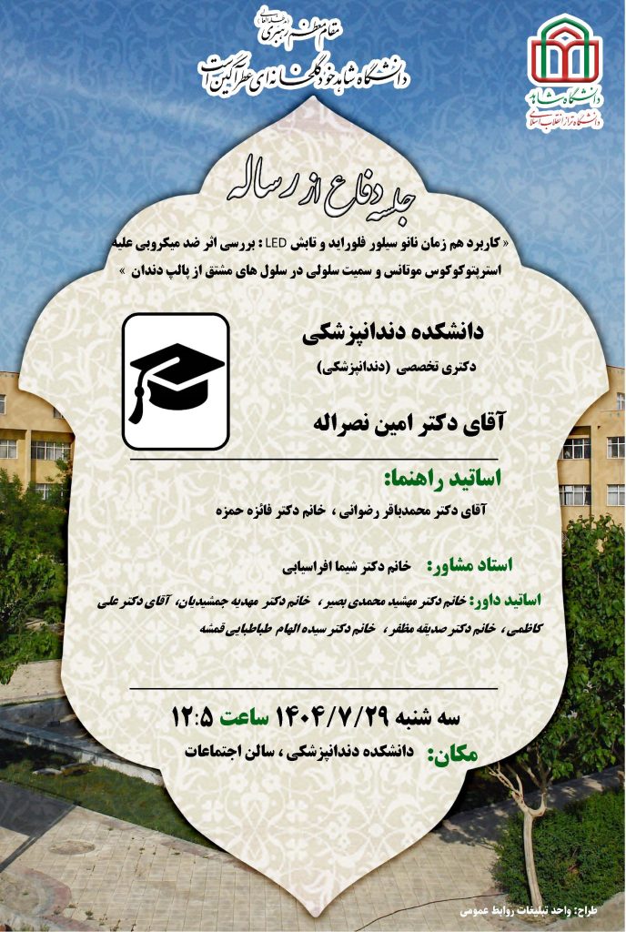 جلسه دفاع از پایان نامه آقای دکتر امین نصراله، دانشجوی دکتری تخصصی (دندانپزشکی) دانشکده دندانپزشکی، سه شنبه 29 مهرماه 1404 ساعت 12:30 در سالن اجتماعات دانشکده دندانپزشکی برگزار میگردد.
