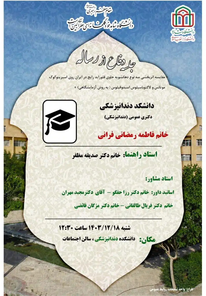 جلسه دفاع از پایان نامه خانم فاطمه رمضانی فرانی ، دانشجوی دکتری عمومی (دندانپزشکی) دانشکده دندانپزشکی، شنبه 18 اسفندماه 1403 ساعت 12:30 در سالن اجتماعات دانشکده دندانپزشکی برگزار میگردد.