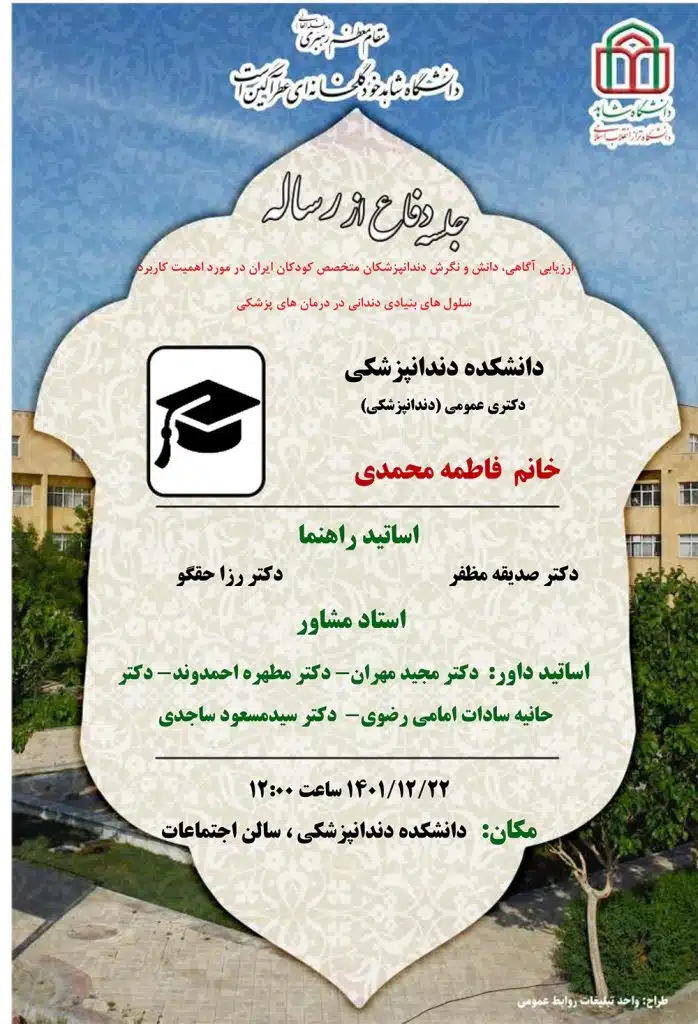 جلسه دفاع از پایان نامه خانم فاطمه محمدی، دانشجوی دکتری عمومی (دندانپزشکی) دانشکده دندانپزشکی، دوشنبه 22 اسفندماه 1401 ساعت 12 در سالن اجتماعات دانشکده دندانپزشکی برگزار میگردد.