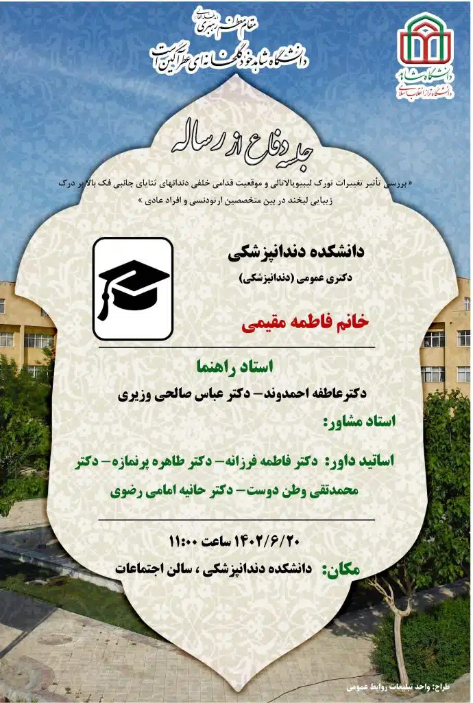جلسه دفاع از پایان نامه خانم فاطمه مقیمی ، دانشجوی دکتری عمومی (دندانپزشکی) دانشکده دندانپزشکی، دوشنبه 20 شهریور ماه 1402 ساعت 11 در سالن اجتماعات دانشکده دندانپزشکی برگزار میگردد.