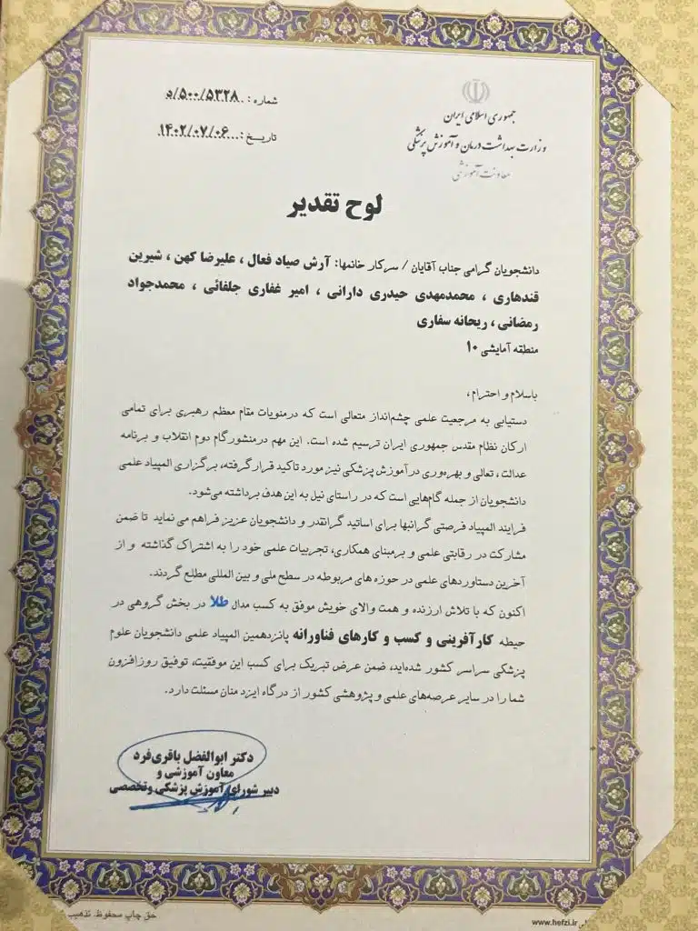 آقایان محمد مهدی حیدری دارایی و محمد جواد رمضانی، در پانزدهمین المپیاد دانشجویان علوم پزشکی سراسر کشور در بخش گروهی در حیطه کارآفرینی و کسب و کارهای فناورانه مدال طلا کسب نموده اند .