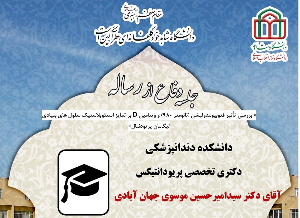 جلسه دفاع از پایان نامه آقای دکتر هرمز دهقانی سلطانی، دانشجوی دکتری تخصصی پریودانتیکس دانشکده دندانپزشکی، شنبه 22 مهرماه 1402 ساعت 12:30در سالن اجتماعات دانشکده دندانپزشکی برگزار میگردد.