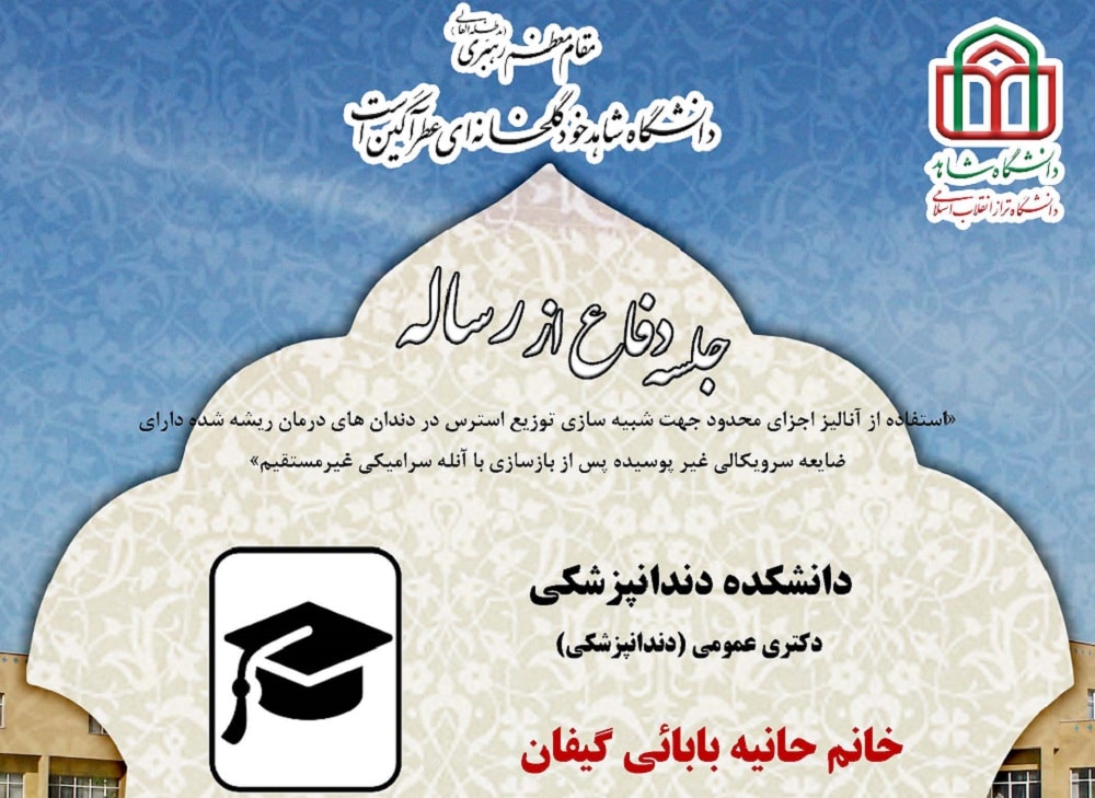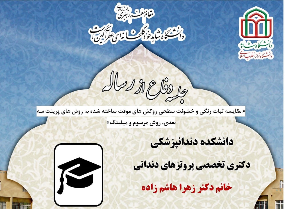 جلسه دفاع از پایان نامه خانم دکتر زهرا هاشم زاده، دانشجوی دکتری تخصصی پروتزهای دندانی دانشکده دندانپزشکی، یکشنبه 23 مهرماه 1402 ساعت 12:30در سالن اجتماعات دانشکده دندانپزشکی برگزار میگردد.