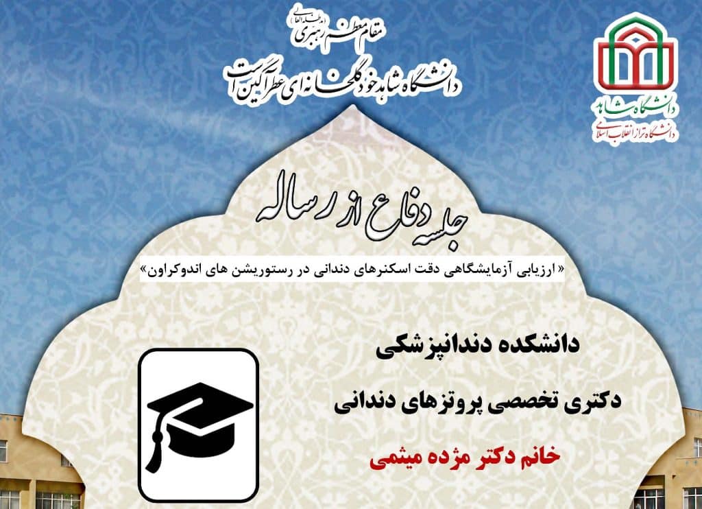 جلسه دفاع از پایان نامه خانم دکتر مژده میثمی، دانشجوی دکتری تخصصی پروتزهای دندانی دانشکده دندانپزشکی، چهارشنبه 26 مهرماه 1402 ساعت 12:30در سالن اجتماعات دانشکده دندانپزشکی برگزار میگردد.