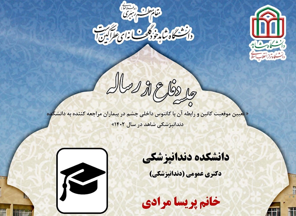 جلسه دفاع از پایان نامه آقای فرحان یعقوبی ، دانشجوی دکتری عمومی (دندانپزشکی) دانشکده دندانپزشکی، شنبه 18 آذر ماه 1402 ساعت 11 در سالن اجتماعات دانشکده دندانپزشکی برگزار میگردد.