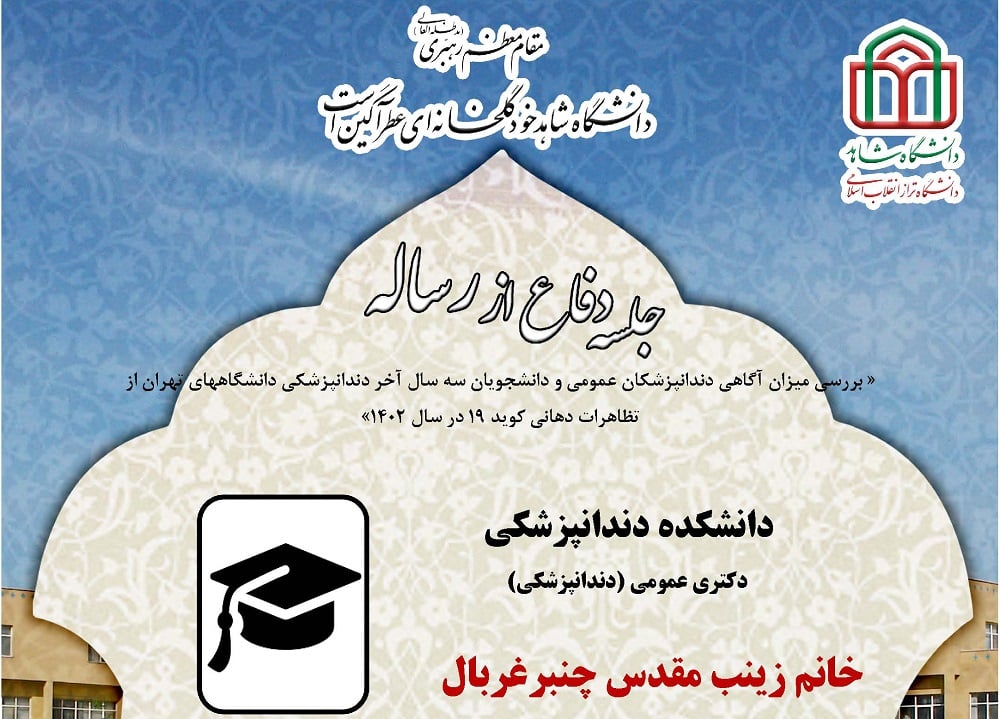 جلسه دفاع از پایان نامه خانم زهرا محمد جعفری ، دانشجوی دکتری عمومی (دندانپزشکی) دانشکده دندانپزشکی، چهارشنبه 20 دیماه 1402 ساعت 11:30 در سالن اجتماعات دانشکده دندانپزشکی برگزار میگردد.