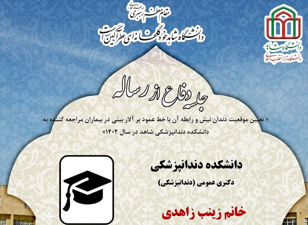 جلسه دفاع از پایان نامه خانم زینب زاهدی ، دانشجوی دکتری عمومی (دندانپزشکی) دانشکده دندانپزشکی، یکشنبه 15 بهمن ماه 1402 ساعت 9:30 در سالن اجتماعات دانشکده دندانپزشکی برگزار میگردد.