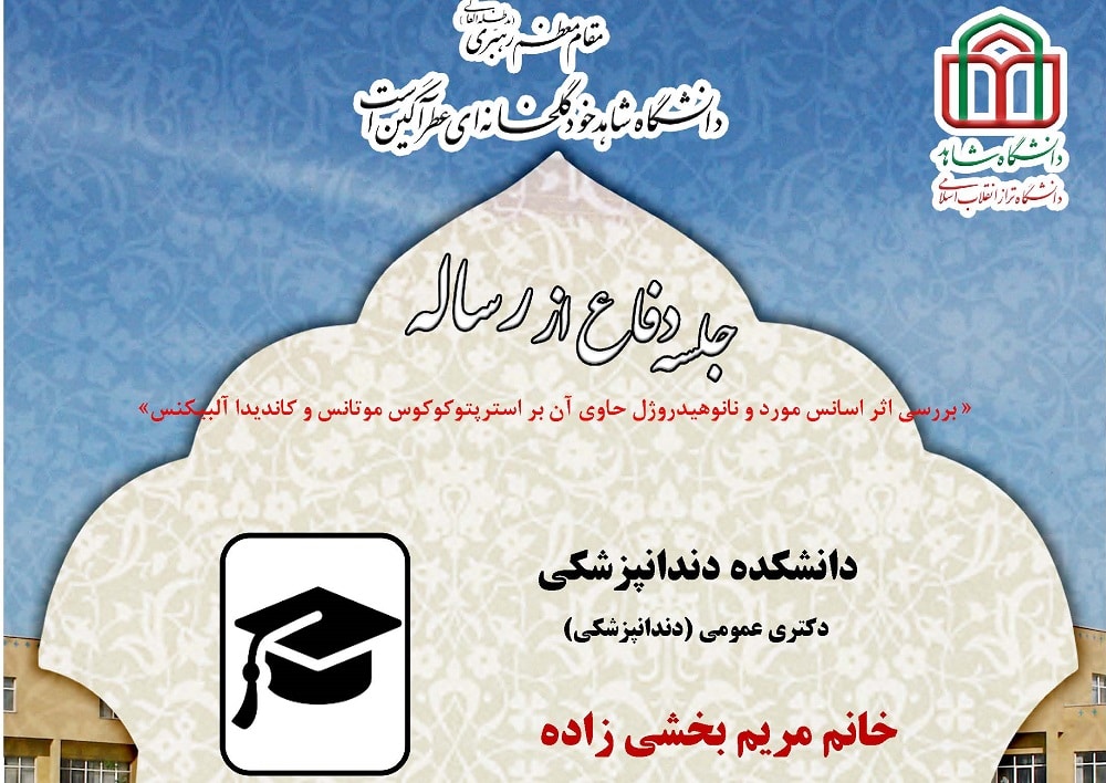 جلسه دفاع از پایان نامه خانم مریم بخشی زاده ، دانشجوی دکتری عمومی (دندانپزشکی) دانشکده دندانپزشکی، چهارشنبه 2 اسفندماه 1402 ساعت 11:30 در سالن اجتماعات دانشکده دندانپزشکی برگزار میگردد.