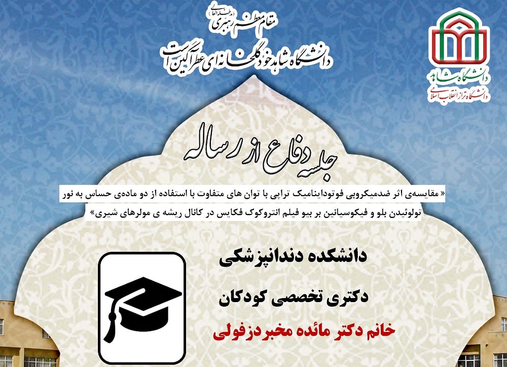 جلسه دفاع از پایان نامه خانم دکتر مائده مخبر دزفولی، دانشجوی دکتری تخصصی کودکان (دندانپزشکی) دانشکده دندانپزشکی، شنبه 10 تیر ماه 1402 ساعت 13 در سالن اجتماعات دانشکده دندانپزشکی برگزار میگردد.