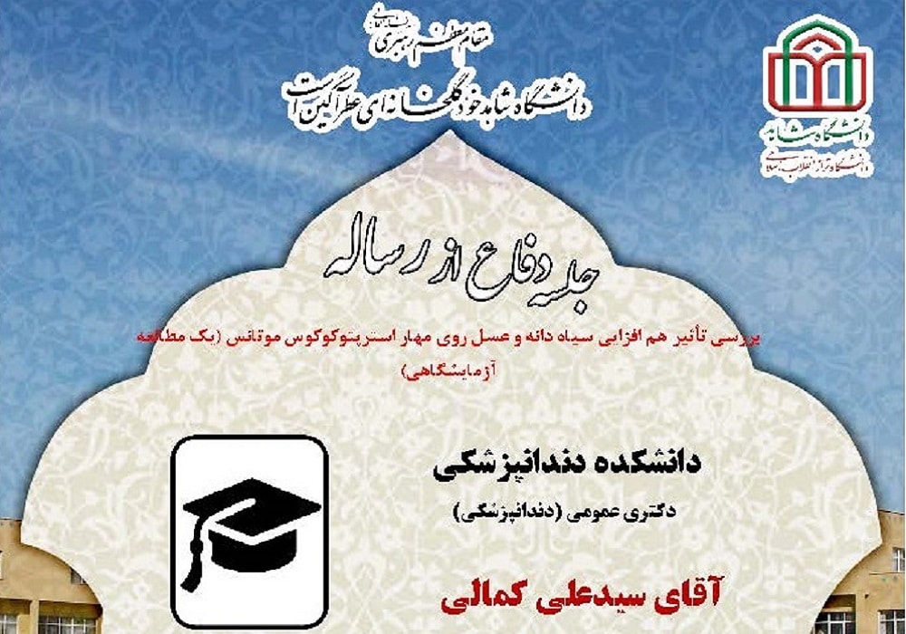 جلسه دفاع از پایان نامه آقای سیدعلی کمالی ، دانشجوی دکتری عمومی (دندانپزشکی) دانشکده دندانپزشکی، چهارشنبه 31 خرداد ماه 1402 ساعت 11:30 در سالن اجتماعات دانشکده دندانپزشکی برگزار میگردد.